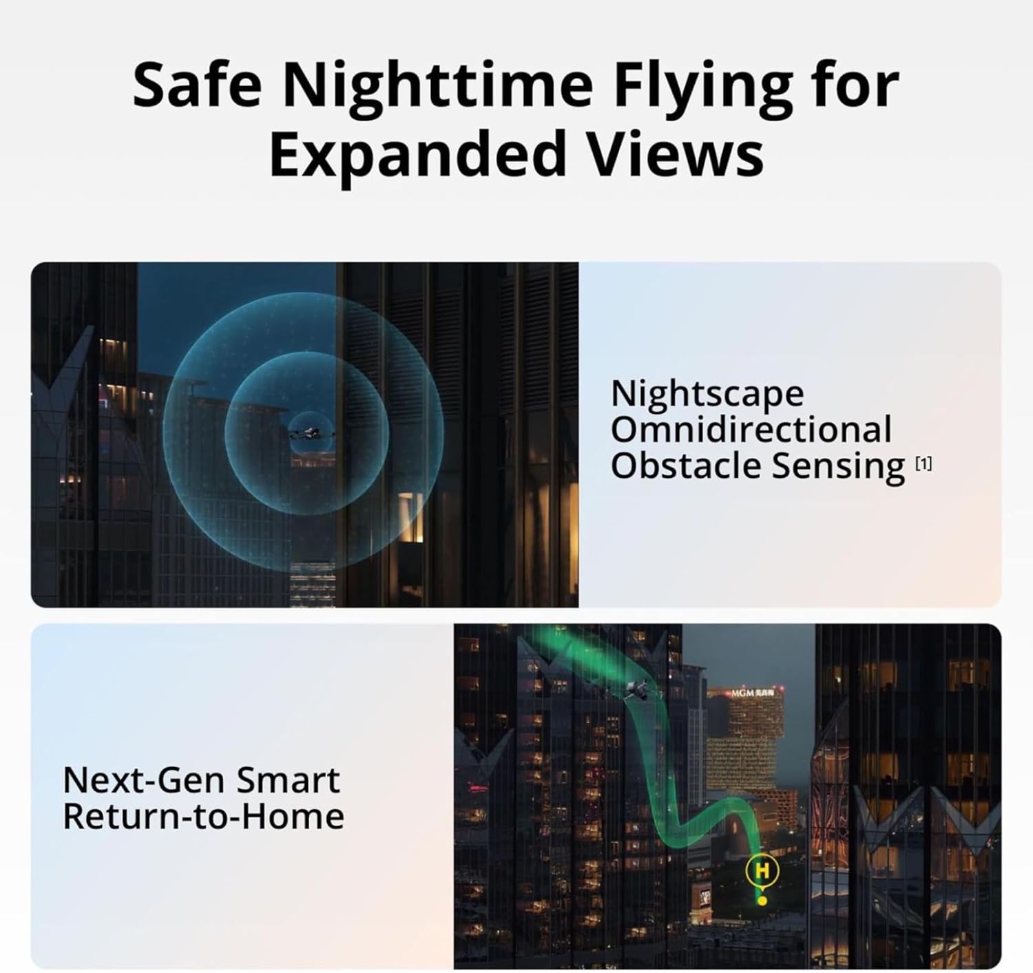 تأتي هذه الطائرة بكاميرتين 4K بجودة عالية تسمح لك بالتبديل بين العدسة العريضة والتقريب للحصول على اللقطة المثالية، سواء كانت مناظر طبيعية أو تفاصيل قريبة.